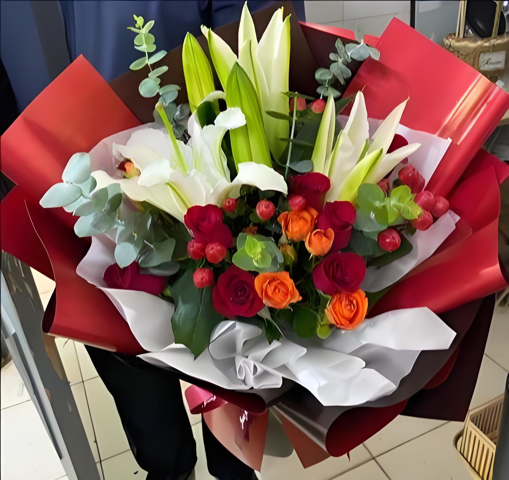 辽源东辽县花店包11枝红玫瑰、2枝多头白百合、6枝橙色多头玫瑰、红豆、尤加利叶